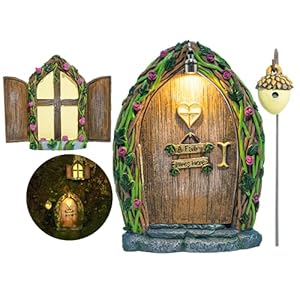 Glows in the Dark: This fairy door is beautifully hand painted and sculpted with realistic details and a natural woodland look, with climbing vines, roses and A Fairy Lives Here sign; It includes a fairy door that opens and has a light, also one glow in the dark window and a little bird house which will collect sunlight during the day to give your garden a whimsical look at night; It looks absolutely magical nestled at the base of a tree or hidden in the bushes for the little ones to findSKU: n/a -