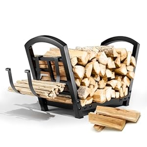 【SIMPLE & PRACTICAL】:The firewood holder consists of only three parts, easy assembly. Side rails are aesthetically pleasing and prevent firewood from sliding off. Fire log holder equipped with two enlarged removable hooks for kindling.