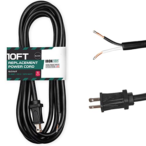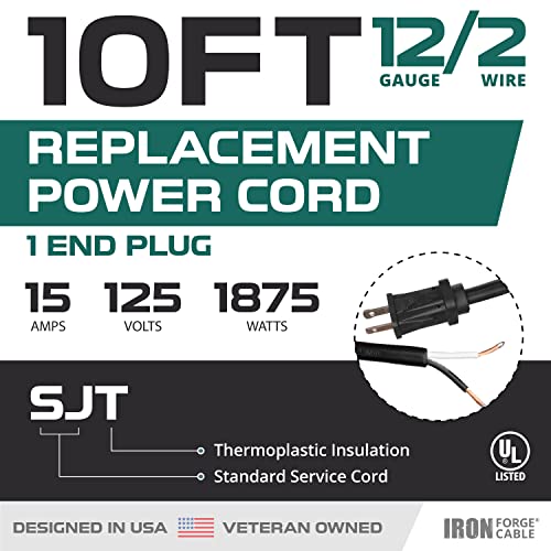 12 AWG Replacement Power Cord with Open End – 10 Ft Black Extension Cable, 2 Wire 12/2 SJT