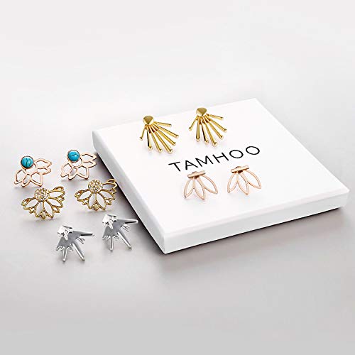 18 Pairs Multiple Dainty Lotus Flower Ear Jacket Earrings-Minimalism CZ Bar Turquoise Studs-White Rose Gold Plated Statement Chic Fashion Stud Earring Set New Year Christmas Gift for Teens Girl Women