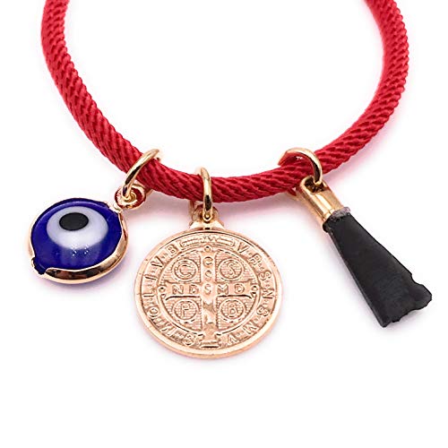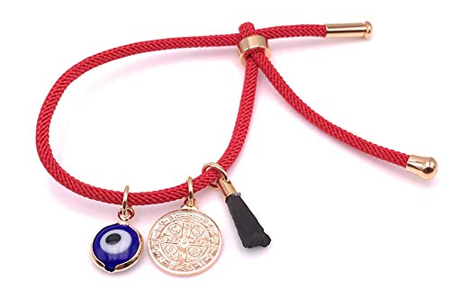 18K Gold Plated Saint Benedict Red String Bracelet Adjustable Charm Evil Eye & Dainty Genuine Azabache Hand