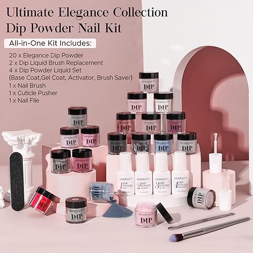 【What You Get】 20 X Gorgeous colors nail dip powder (0.34 oz. each), 4 X Dip Powder Liquids Set (with base coat/top coat/activator/brush saver, 0.34 oz. each), 5 X Additional professional dip manicure tool (with nail brush/cuticle pusher/nail file/2*dip powder gel brush replacement), User Manual Quick Start Guide, AZUREBEAUTY home dip nail kit can get nail art salon-quality equipment for small fee.