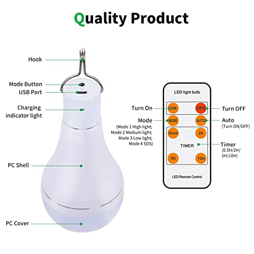 5 Lighting Mode & Timer: The rechargeable led light bulb with 5 modes, High 300lm/ Medium 150lm/ Low 75lm/ SOS /When charging, the light will automatically turn off to protect the charge; you can remote setting timing 0.5/2/5/10 hours auto turn Off the solar camping light, very convenient.
