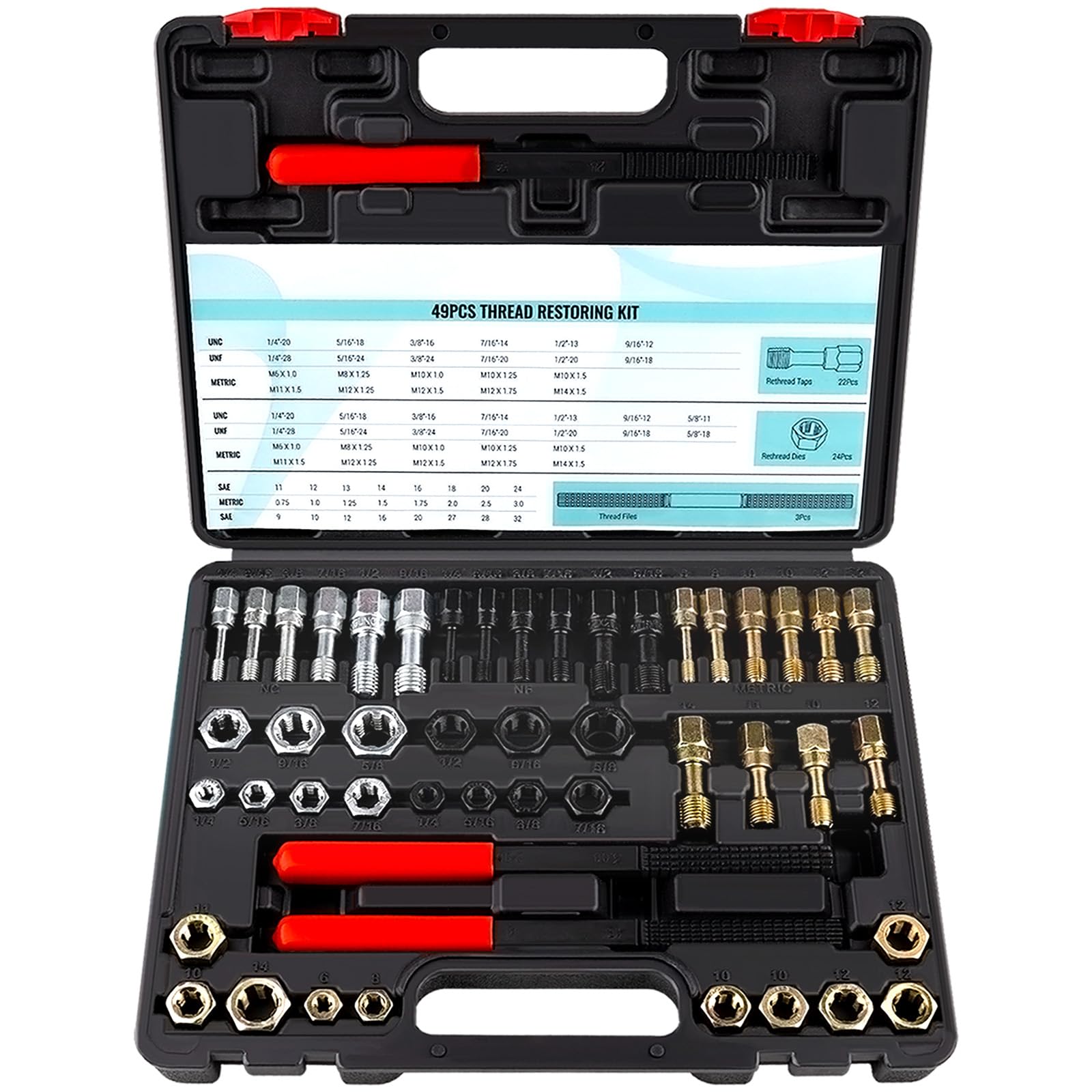 - THREAD REPAIR KIT: Includes 22 taps, 24 dies, and 3 thread files in UNC, UNF, and Metric sizes. Covers essential thread specifications for automotive, mechanical, and industrial applications
