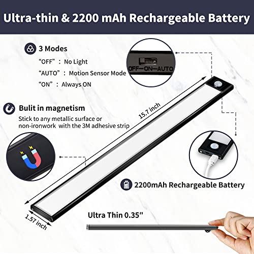 šŸ’” Upgraded 2200mAh Battery Get Up To 1 Months Of Use On A Single Charge: Our energy-efficient USB rechargeable under cabinet lighting can last for 1-2 months (Use it 10 times a day, 20-30 seconds each time) in the energy-saving motion sensor mode or up to 6-8 whole hours of continuous use in the ON mode.