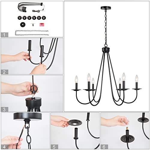 Black Chandelier, Farmhouse Lighting Chandeliers for Dining Rooms, 6 Lights Candle Matte Black Ceiling Hanging Light Fixture, 28” W x 25”H