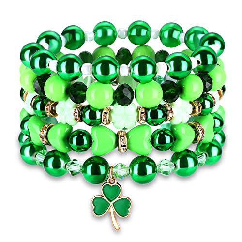 BSJELL 5 Pack Beaded Bracelet Stackable Christmas Thanksgiving St. Patrick’s Day Valentine’s Day Beaded Stretch Bracelet Holiday Charm Bracelets Festive Jewelry Gifts for Women (Green)