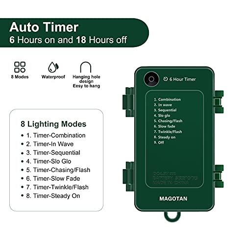 🎄EASY OPERATION LED STRING LIGHTS WITH 8 MODES: Press the button on the battery box to select the mode from 8 options: Combination, In wave, Sequential, Slo glo, Chasing/Flash, Slow fade, Twinkle/Flash, Steady on. Timer function will be activated as you turn the string lights on, no more operation needed