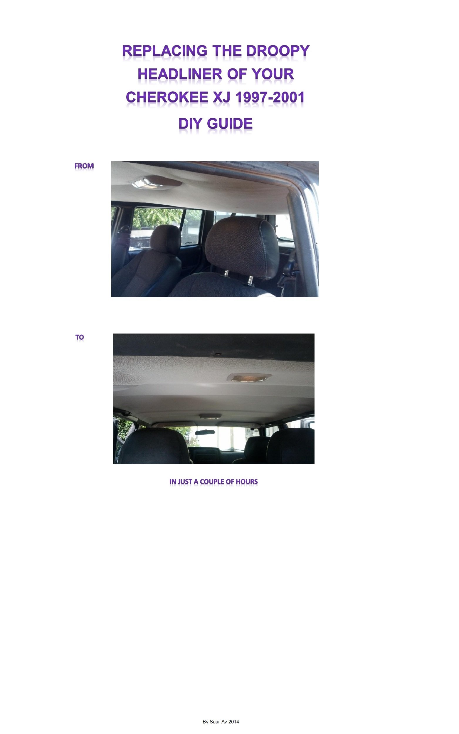 This guide will explain how to replace the old droopy headliner of your 1997-2001 Cherokee XJ.It is a step by step with photos guide, so you’ll be able to finish that job in a couple of hours by yourself without paying few hundreds of dollars to the dealer.