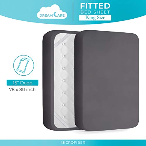 DREAMCARE King Fitted Sheet – Deep Pocket Fitted Sheet – Fits up to 15 inch Mattress – Deep Pocket King Sheets – Hotel Luxury – Shrinkage & Fade Resistant – 1 Fitted Sheet Only (Grey, King)