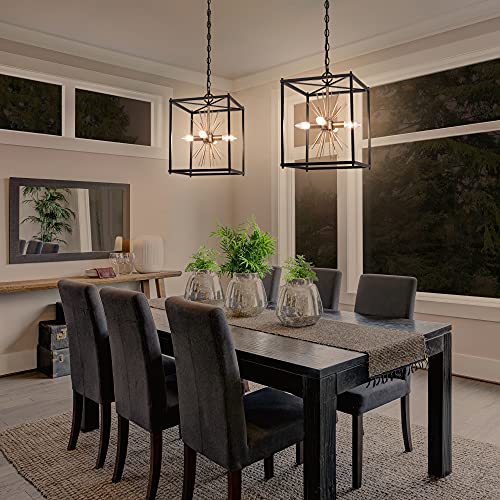 Durent Lighting Modern Farmhouse Chandelier, 4-Light Black Chandelier with Gold Starburst Design, Industrial Square Metal Pendant Light Fixture for Foyer, Dining Room, Kitchen Island, 12″Lx12″Wx14″H