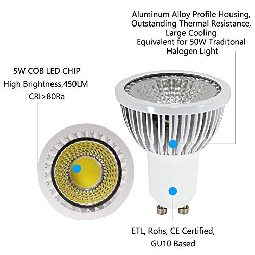EASY INSTALLATION: GU10 base LED Spotlight GU10 Base COB Flood Light.,easy to install without transformer.,High color rendering index, high luminous efficiency,Perfect for track lighting.