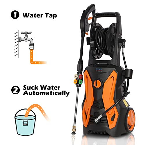 【On Board Hose Reel】: 32ft electric high power washer hose is long enough for the projects you need it for, the built in on-board hose reel to conveniently protect and helps prevent kinks in the high-presure hose and makes winding or unwinding a simple task.