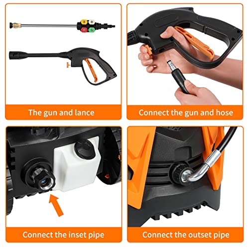 【Powerful Pressure Washer】—2000W powerful pressure washer delivers a Max.3600PSI working pressure with Max. 2.4GPM water flow for fast cleaning, IPX5 waterproofing system,The inlet filter effectively prevents mechanical blockage.