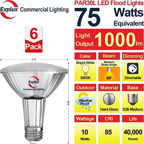 Explux Commercial-Grade LED PAR30 Flood Light Bulb, 75W Equivalent, 40000 Hours, Dimmable, Full-Glass Waterproof & Anti-Ageing, Bright White 3000K, 6-Pack