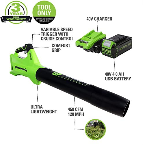 The Greenworks 40V lithium-ion platform powers over 40 outdoor products, including lawn mowers, blowers, string trimmers, chainsaws, hedge trimmers, and much more! The 40V lithium-ion battery provides the power you need, and delievers fade-free power with no memory loss after charging. The outdoor power equipment allows you to tackle up to 1/2 acre with the available 2Ah, 2. 5Ah, 3Ah, 4Ah, 5Ah, and 6Ah batteries. USB ports are integrated into the BAF701, BAF702, L-300, BAF704, BAF705, L-600 batteries, making it a portable charger for phones, tablets, and other compatible electronic accessories. The Greenworks 40V platform comes with a 3 year tool / battery to protect your investment