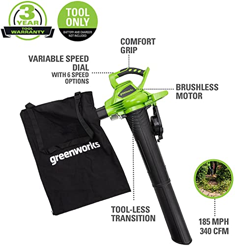 Greenworks 40V (185 MPH / 340 CFM / 75+ Compatible Tools) Cordless Brushless Leaf Blower / Vacuum, Tool Only