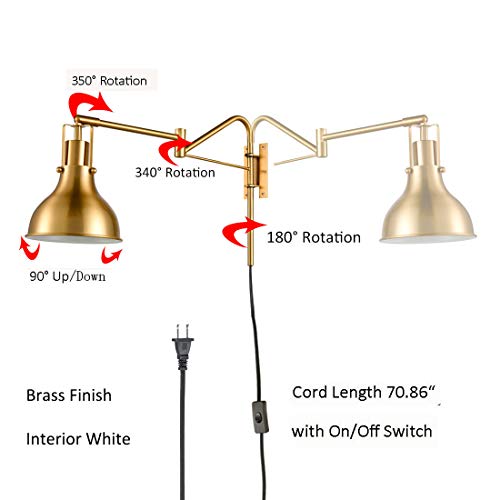TYPE:Modern Bedroom Swing Arm Wall Sconce Plug-in Cord with 0n/Off Switch,Brass Bedside Reading Lamp,1-Light.
