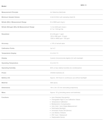 The HORIBA LAQUAtwin NO3-11 is a compact and versatile nitrate ion meter that is perfect for testing water, viscous liquids, solids, and powder samples. With its easy-to-use design, this meter provides accurate and reliable results in just seconds. Whether you’re testing water quality in the field or monitoring nitrate levels in your production process, the HORIBA LAQUAtwin NO3-11 is the perfect tool for the job. Trust in HORIBA