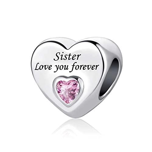 KunBead Sister Heart Love You Forever Birthday Pink Birthstone Girl Bead Charm fit Bracelets Necklace for Women