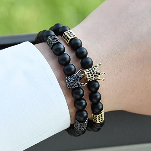 HYHONEY 2 Pcs Micro Pave Zircon Crown King Charm 8mm Beads Bracelet For Men Women His And Hers Couple Bracelet Black Matte Onyx Stone Elastic Adjustable Friendship Bracelets Beaded Bracelets