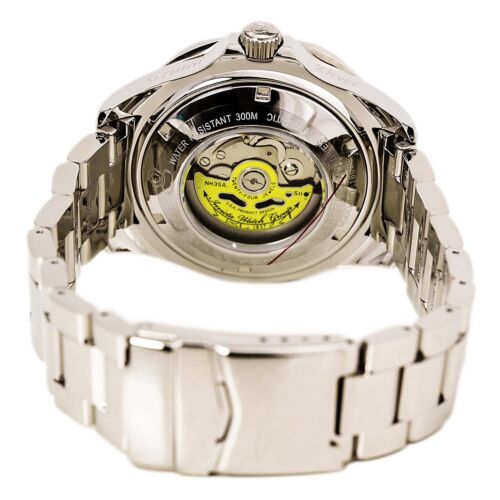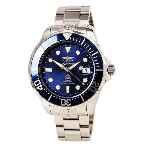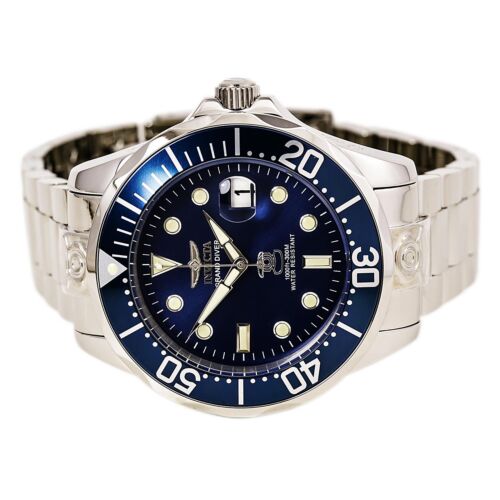 Invicta 16036 Grand Diver men’s automatic dive watch features a 47mm wide and 17mm thick solid stainless steel case with a unidirectional rotating blue accented bezel and textured screw down crown. Invicta 16036 is powered by a precise Japanese TMI NH35A automatic movement with 24 jewels. This stylish watch also features a shiny sunray blue dial with green accents silver tone luminous hands and hour markers along with the date display function, scratch resistant mineral crystal and water resistant to 300 meters. Invicta 16036 is equipped with a 22mm wide solid stainless steel bracelet with a fold over safety lock clasp. Invicta 16036 men’s Grand Diver blue dial steel bracelet automatic dive watch is brand new and comes in an original Invicta gift box and is backed by a 3 years limited warranty.