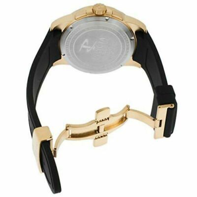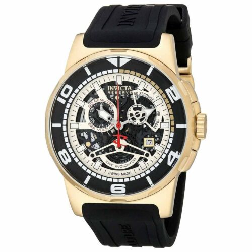 Invicta 18947 Reserve chronograph men’s watch features a 47mm wide and 15mm thick yellow gold plated solid stainless steel case with a black accented fixed bezel and textured push-pull crown with function pushers. Invicta 18947 is powered by Swiss ISA 8172/220 quartz chronograph movement. This stylish watch also features a textured black, grey and gold tone skeleton dial with white accents silver tone luminous skeleton hands and index hour markers along with the chronograph and day-date display functions, scratch resistant flame fusion crystal and water resistant to 100 meters. Invicta 18947 is equipped with a 24mm wide black silicone rubber strap with a deployment push button clasp. Invicta 18947 men’s Reserve chronograph quartz skeleton dial black silicone strap watch is brand new and comes in an original Invicta gift box and is backed by a 3 years limited warranty.