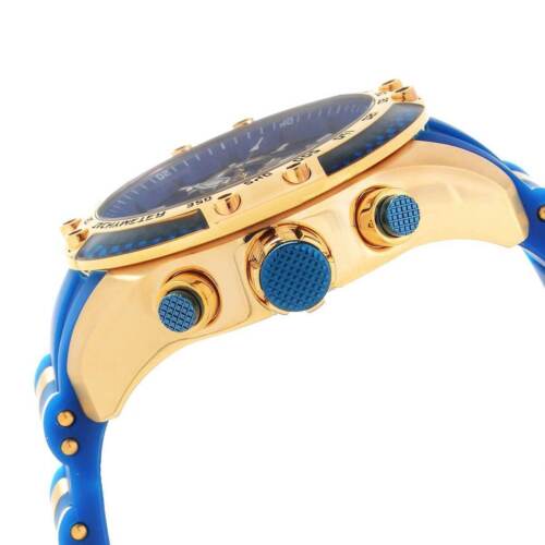 Invicta 25941 Speedway chronograph men’s watch features a 50mm wide and 17mm thick yellow gold plated solid stainless steel case with a blue glass fiber accented fixed bezel and textured push-pull crown with function pushers. Invicta 25941 is powered by Japanese TMI VD54 quartz chronograph movement. This stylish watch also features a textured shiny sunray blue glass fiber dial with white accents gold tone luminous skeleton hands and index hour markers along with the chronograph and 12/24-hour time functions, scratch resistant flame fusion crystal and water resistant to 100 meters. Invicta 25941 is equipped with a 26mm wide blue silicone rubber and yellow gold plated solid stainless steel insert strap with a buckle clasp. Invicta 25941 men’s Speedway blue glass fiber dial chrono watch is brand new and comes in an original Invicta gift box and is backed by a 3 years limited warranty.