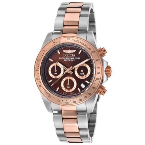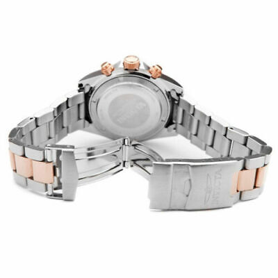 Invicta 17029 Speedway chronograph men’s dive watch features a 39mm wide and 13mm thick two tone rose gold ion plated solid stainless steel case with a fixed bezel and textured screw down crown with function pushers. Invicta 17029 is powered by a precise Japanese VD53B-14 quartz chronograph movement. This stylish watch also features a shiny sunray brown dial with white accents rose gold tone luminous hands and hour markers along with the chronograph, dual-time and date display functions, scratch resistant mineral crystal and water resistant to 200 meters. Invicta 17029 is equipped with a 20mm wide two tone rose gold ion plated solid stainless steel bracelet with a fold over safety lock clasp. Invicta 17029 men’s Speedway brown dial two tone steel chronograph dive watch is brand new and comes in an original Invicta gift box and is backed by a 3 years limited warranty.