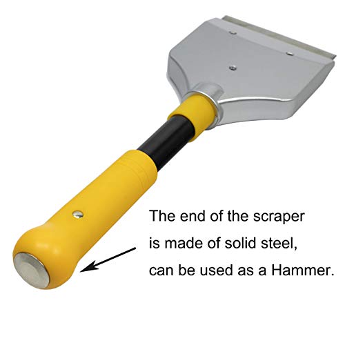 Double-edged steel blade, 2.5mm ultra thick, built for long lasting. Powerful for remove stubborn stain. Comfort non-slip PVC grip. The end of the scraper can be use as a hammer