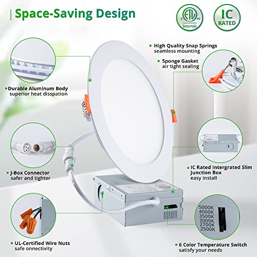 ✅6 Color Temperature Adjustable: 2500K, 2700K, 3000K, 3500K, 4000K, 5000K, 6 color temperatures selectable. Easily choose ambience via the switch on the J-box. Never worry about exchanging and returning the recessed lights due to inappropriate color temperature.