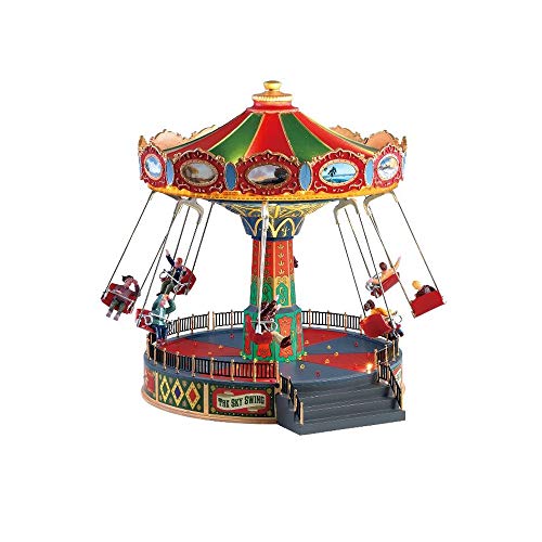 Lemax The Sky Swing with Adaptor Item # 84379 Features Include: Lights, Sounds and Motion Riders revolve Lights on edge/roof of the swing and on the platform flash on and off alternately Volume Control and Power Switch for all functions Adaptor included This unit will draw approx. 450mA current at 4.5V DC Approx. size: ( H x W x D ) 10.63 x 8.66 x 10.16 inches