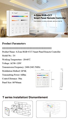 Product Name:Mi.Light T4 Wireless 2.4G RF 4-Zone Wall-Mounted Smart Touch Screen Panel Controller AC 90-120V Only Work With Mi-Light RGB+CCT Series The Newest Version LED Light Bulb,Spotlight,Downlight,Flood Light