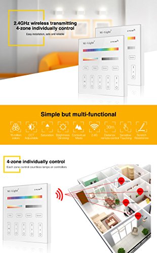 3) 4 Zones Control: You can divide all lamps into 4 zones.Each zone can control controlless lamps or led strip controllers.You do not have to install 1pcs panel controller for each lamps.Each zone can be any lamps within 30 meters ( 98 feet).