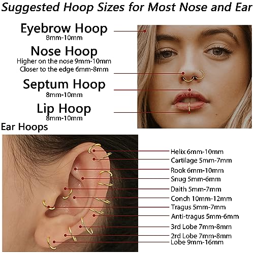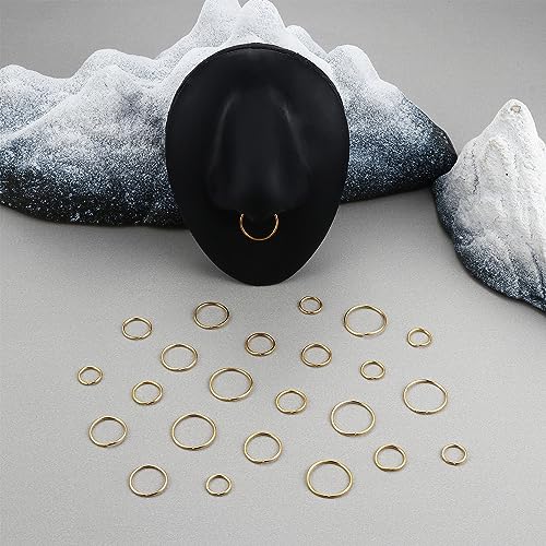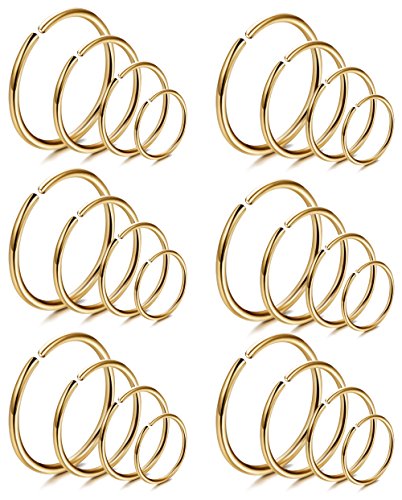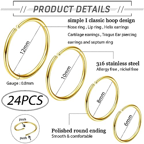 LOYALLOOK 18Pcs 20G 316L Stainless Steel Nose Ring Hoop Cartilage Hoop Septum Piercing 6-12mm (J:24PCS Gold Tone)