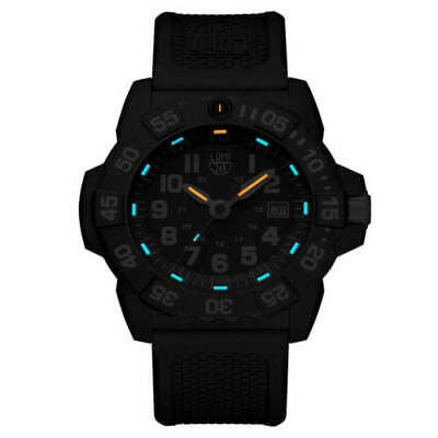 Luminox 3503 Navy Seal 3500 men’s dive watch features a 45mm wide and 14mm thick black carbon compound case with a unidirectional rotating bezel and textured double-security gasket push-pull crown. Luminox 3503 is powered by Swiss Made quartz movement. This stylish watch features a sharp looking blue dial with orange T25 tritium night vision tubes accents white luminous hands and Arabic numeral hour markers along with the 12/24-hour time and date display functions, scratch resistant hardened mineral crystal and water resistant to 200 meters. Luminox 3503 is equipped with a 24mm wide black polyurethane rubber strap with a buckle clasp. Luminox 3503 men’s Navy Seal 3500 Swiss quartz blue dial dive watch comes in an original Luminox gift box and is backed by a year limited warranty.