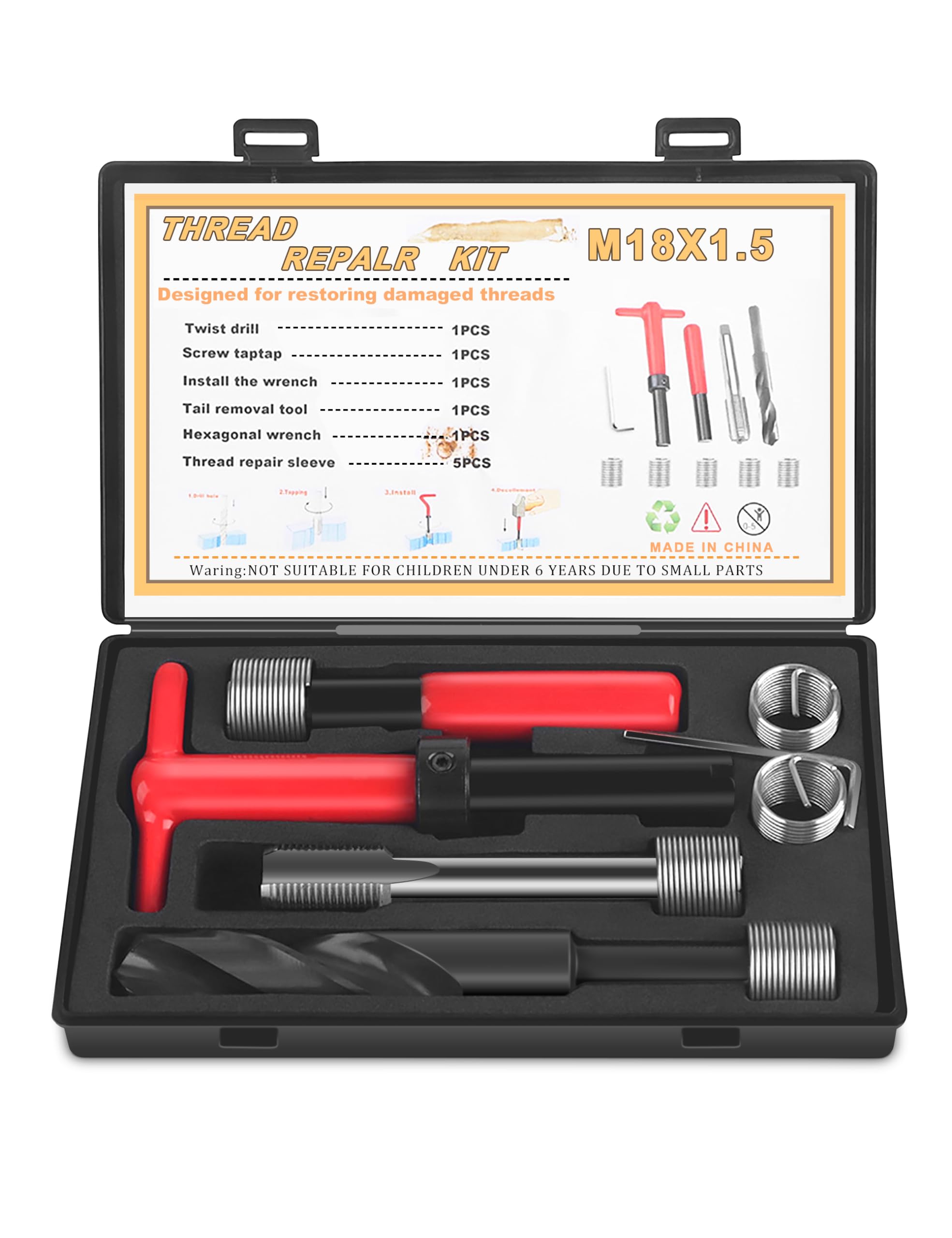 - Convenient Metric-Imperial Conversion: With the Thread Repair Tool Kit, you can easily convert metric thread measurements to imperial units. The threaded inserts offer compatibility and versatility, it includes universal M18x1.5(length 1.5D) thread, making it a convenient and quick solution for all your thread repair needs. No need for complex calculations or measurements, simply use the appropriate threaded insert for your desired conversion and achieve accurate and results