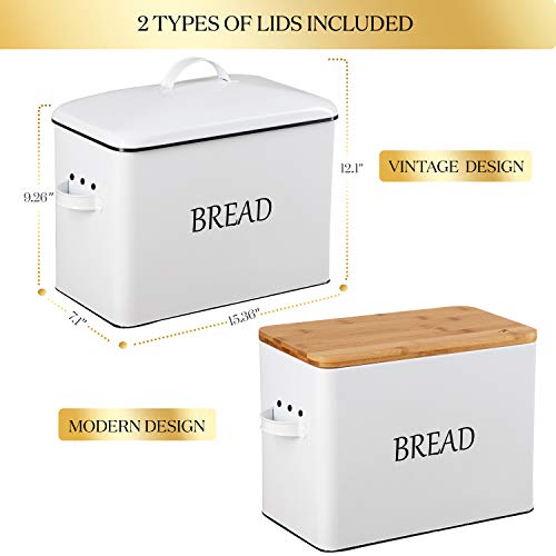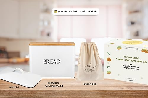 Meraki Home Bread Storage Container with 2 Lids, Cotton Bread Bag–Farmhouse Bread Boxes for Kitchen Counter Airtight – Metal Box for Homemade Storage (Glossy White)