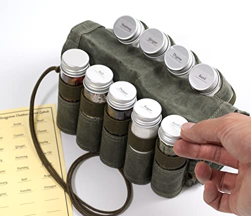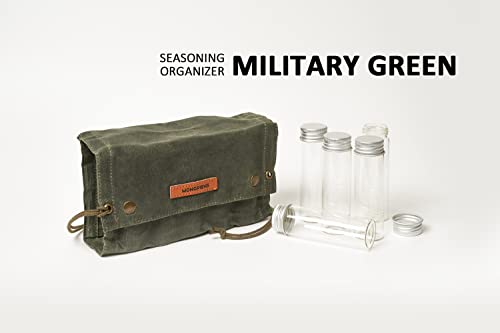 MONGPIENS Camping Spice kit with 9 spice Jar,rope,Spice Labels Sticker,Silicone Collapsible Funnel, Canvas Travel Seasoning container, portable spice bag for travel (MILITARY GREEN)