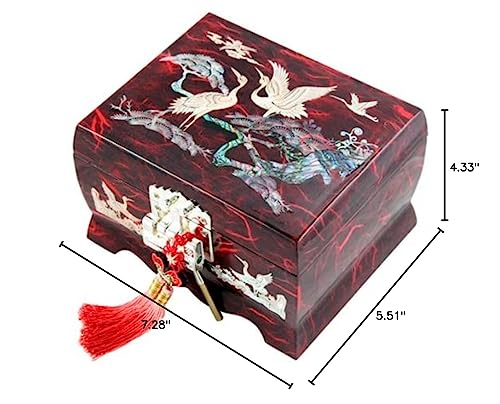 This wooden bird music box is elegantly embellished with mother of pearl design of a pair of cranes delighting in a romantic moment on a pine tree wrought by the intricate mother of pearl inlaying technique. The harmony between the colored Korean mulberry paper and the iridescence of the mother of pearl design makes it a memorable item for any collection. The unique Korean traditional lock and key decorated with Madeup (Korean macrame knots) gives the beautiful panache to this music box. This music box plays the famous Korean folk song, “Arirang. ” “Arirang” is so popular in Korea that it might be called the national folk song. The words have to do with the longing and weary feeling of having been jilted by a lover. Arirang was sung by ordinary people during their hard times to help them overcome fatigue and anguish.