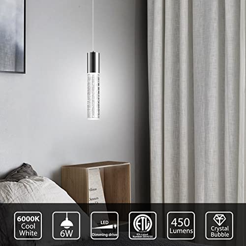Illuminate your space with the OKELI Modern Pendant Light. This sleek LED fixture features crystal bubbles for a touch of elegance, perfect for your kitchen island, dining room, bedroom, hallway, or bar. The chrome finish adds a modern touch to any decor. With 6W of power and a bright 6000K color temperature, this ETL-listed pendant light is both stylish and functional. Upgrade your lighting with the OKELI Modern Pendant Light today.