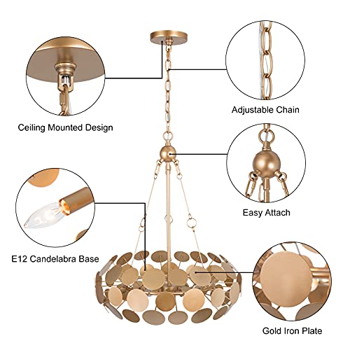 Gold Metal Lampshade — The light fixture comes with a golden lampshade, which is formed from gold iron plates of different sizes, effectively protecting the 3-light cluster while emitting soft and romantic light.