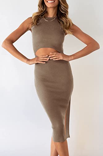 PRETTYGARDEN Women’s Summer Midi Bodycon Dresses Casual Crew Neck Side Slit Sleeveless Knit Cut Out Tank Top Dress (Camel,Large)