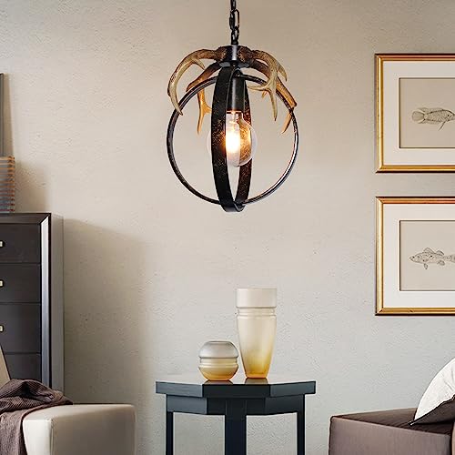 QIANLU Pendant Light Rustic Globe Chandelier- 1Light W12’Black Rust Deer Lamp Fixture for Indoor Kitchen Island Dining Bedoom Hallway Farmhouse Chandelier Small Antler Chandelier