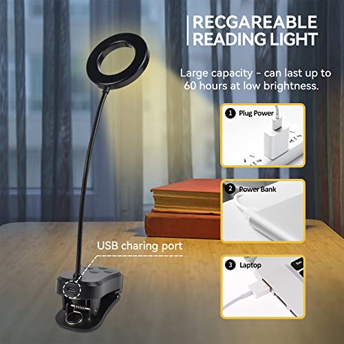 【Rechargeable & Long-Lasting】The reading lamp has a built-in 800mAh lithium battery and supports USB charging. The indicator light is red when charging and turns green when fully charged. Rechargeable via laptop, mobile power, power adapter (not included), etc. Enjoy 60 hours of wireless reading time when fully charged (low brightness setting).