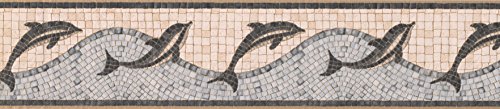 Factory sealed 5 yard roll of Vymura Platinum Superior pre-pasted Vinyl Boarder titled ” Mosaic Dolphin .About 5.25 inches wide made to look like pool tile with colors of; light blue for water ,tans for the sky , and grays for the Dolphin