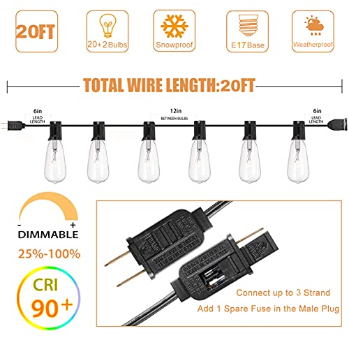 UL Listed: 20 FT long string lights with 22 clear ST40 Edison bulbs,ST40 Intermediate(E17)socket base, UL listed.The male plug built-in Double fuse.(a spare fuse)