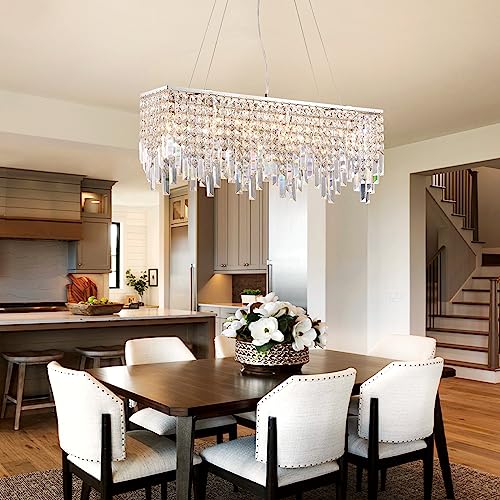 Siljoy Rectangle Crystal Chandelier, Modern Rectangular K9 Crystal Raindrop Chandelier, 6-Lights Flush Mount Pendant Ceiling Light Fixture for Dining Room Kitchen Island L31.5” x W8” x H12”