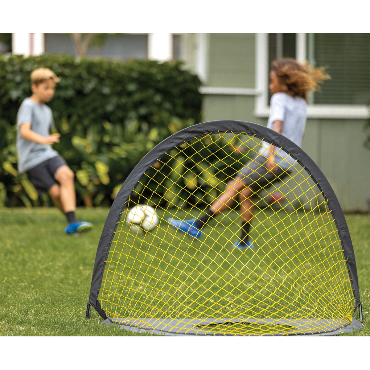 The SKLZ Precision Pop-Up Soccer Goal opens in an instant to create a goal on one side and a training target on the other. With attached ground stakes that hold it firmly in the grass, the goal stands up to the hardest shots and is perfect for pickup games. Switch to its target side and practice as a team or on your own to build coordination, timing, and technique. This goal comes with a convenient carry bag and features an easy twist-open frame design so you can quickly set up for a game or training session anywhere. Build the muscle memory, endurance, and ball control needed to improve passing and shooting.