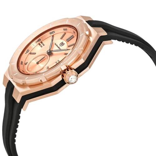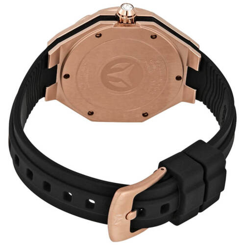 Technomarine TM-118007 Cruise Sea women’s watch features a 37mm wide and 9mm thick rose gold ion plated solid stainless steel case with a fixed bezel and textured push-pull crown. Technomarine TM-118007 is powered by Swiss Ronda 1069 quartz movement with 2 jewels. This beautiful watch also features a shiny sunray rose gold tone dial with white accents silver tone luminous hands and index hour markers, scratch resistant flame fusion crystal and water resistant to 100 meters. Technomarine TM-118007 is equipped with a 17mm wide black rubber strap with a buckle clasp. Technomarine TM-118007 women’s Cruise Sea rose gold dial watch is brand new and comes in an original gift box and is backed by a 2 year limited warranty.